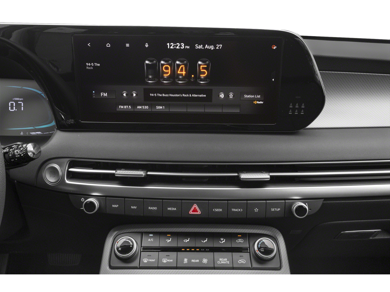 - Radio: AM/FM/MP3 Audio System -inc: 12.3" color touchscreen display, onboard navigation w/traffic flow including incident data via HD Radio (HERE), Over-the-Air (OTA) map updates, SiriusXM, USB, Android Auto and Apple CarPlay, dynamic voice recognition, rear seat quiet mode, Bluetooth® hands-free connectivity w/multiple device connection and Bluelink Connected Car System